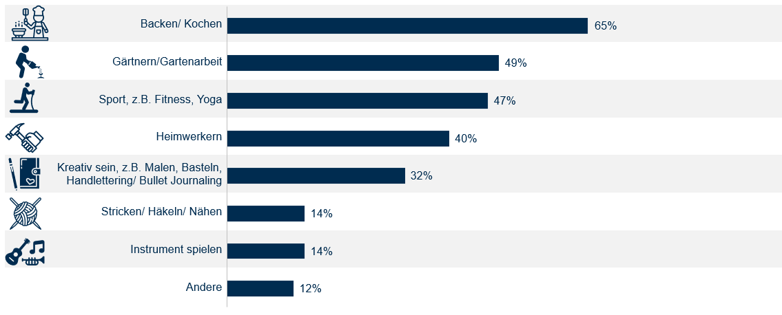 Von den 500 Teilnehmer*innen gaben fast zwei Drittel (65 %) an, dass sie in ihrer Freizeit gerne Backen und Kochen. Daneben tragen Gartenarbeit, Sport, Heimwerkern und die kreative Entfaltung beim Malen, Basteln, Handlettering und Bullet Journaling zum eigenen Wohlbefinden in der Freizeit bei. Weniger häufig wird zur Stricknadel oder zum Instrument gegriffen.